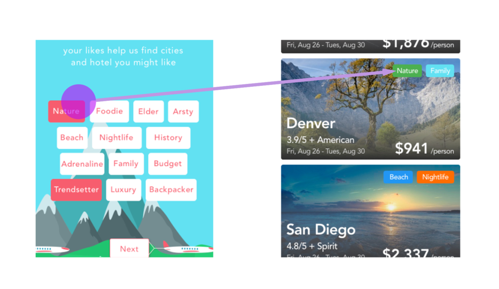 In some of our later tests with the actual iOS prototype app, we found that users were confused about some of the trips they were seeing. This made us bring out the tags on to the trip card to help people know this was something they selected.