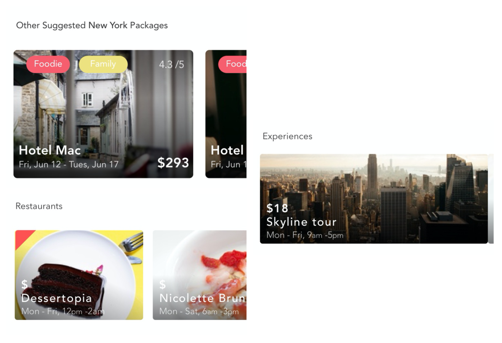 We wanted to add sprinkles on the cupcake before we handed the app off to Expedia. Since we had such a plethora of travel options available in Expedia, we decided to add the following to enrich the packages further -